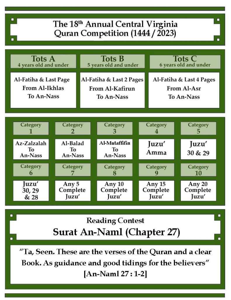 In each category, the contestants will be asked to recite three different questions it could be three Surahs or sections from three Surahs selected by the judges, If contestants fail to recite any of the three questions they automatically receive 0 points in the question they did not recite.